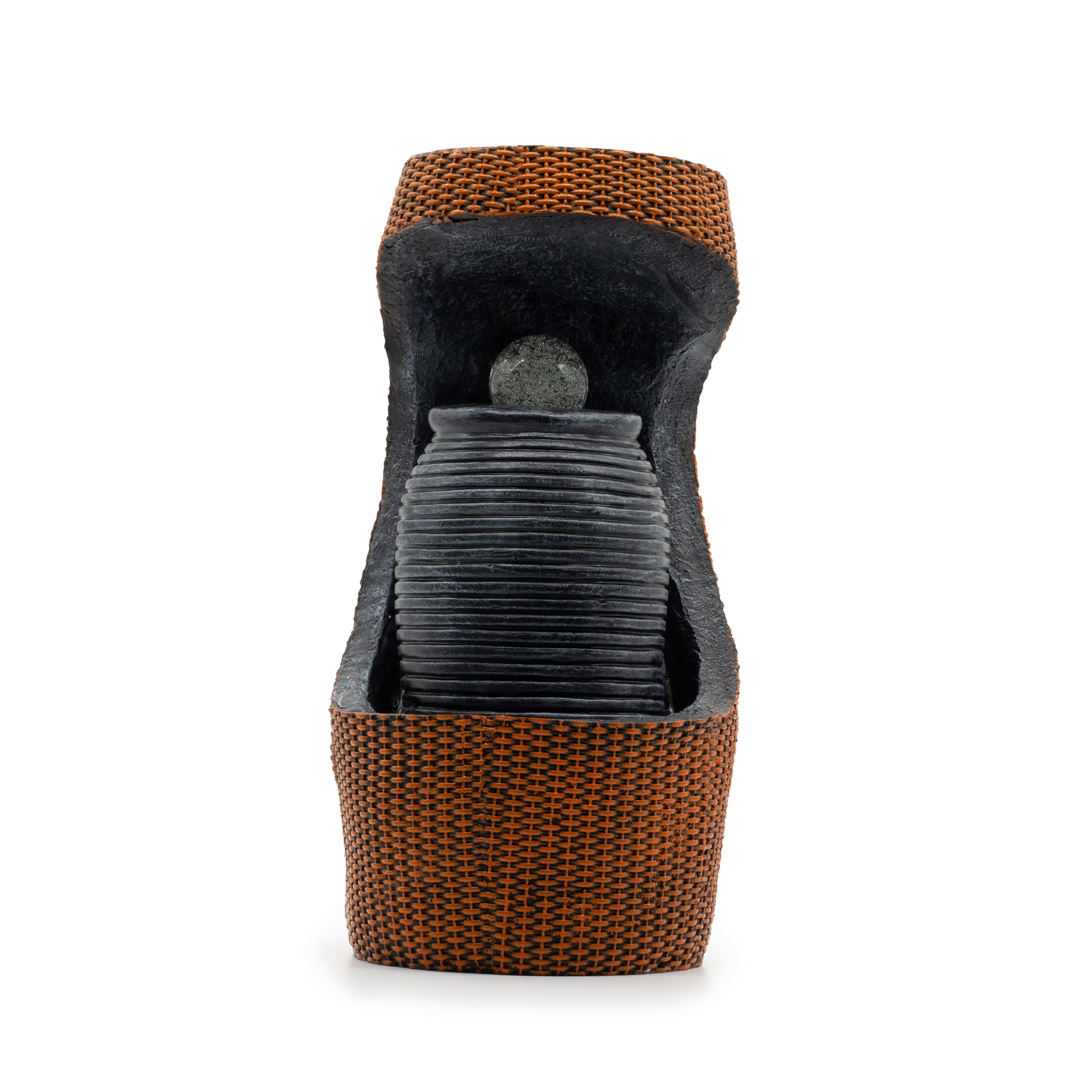 Creëer een krachtig maar harmonieus middelpunt met dit Grote Waterornament – Kleurveranderende Kristallen Bol in Griekse Amfoor met Mand. Geïnspireerd op klassieke amfoorvormen en herwerkt met een eigentijdse textuur, staat de geribbelde amfoor met steenlook in een omhulsel met gevlochten mandstructuur voor extra contrast.