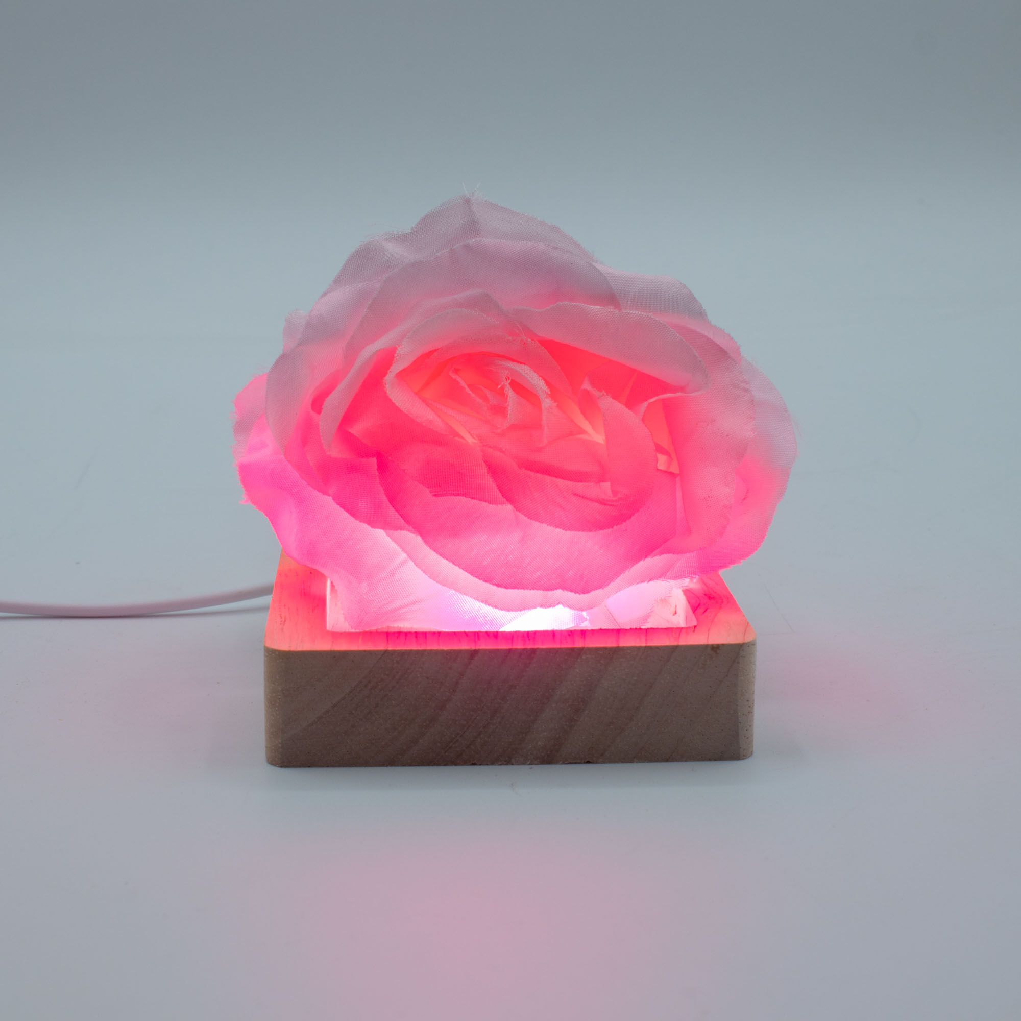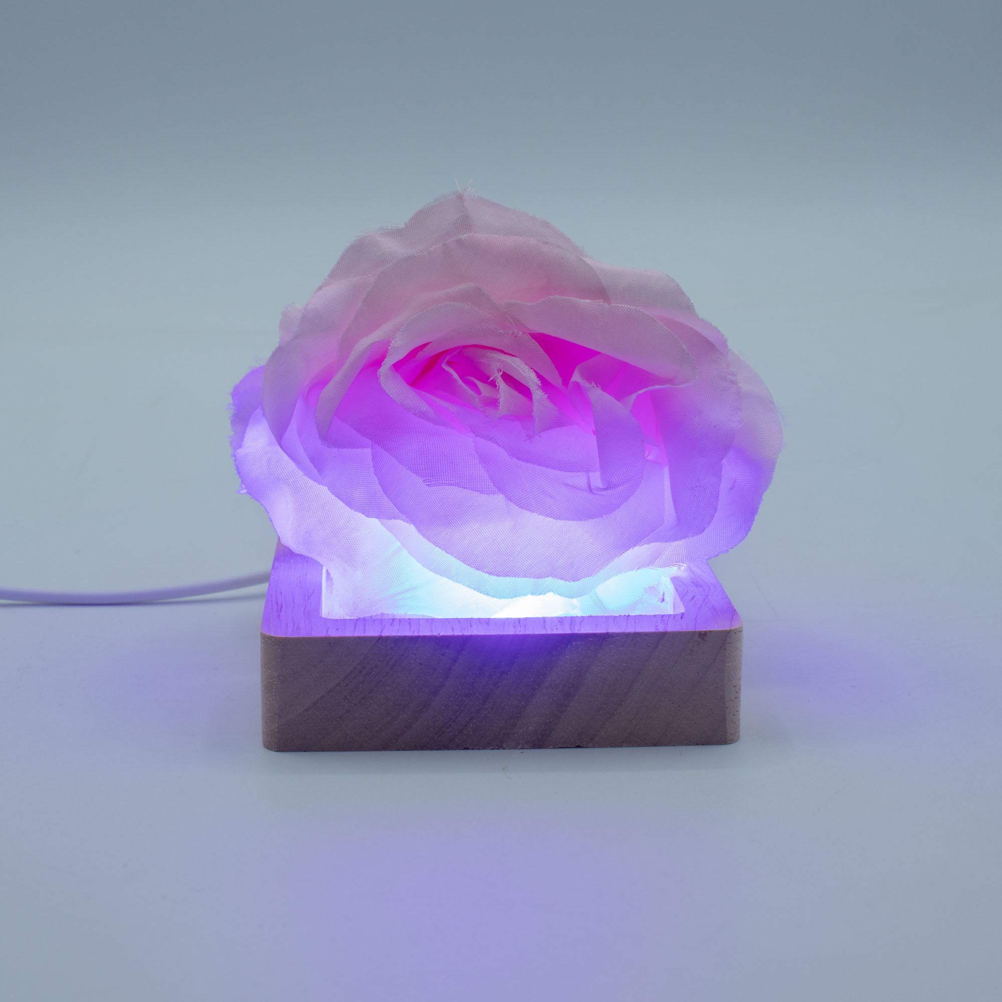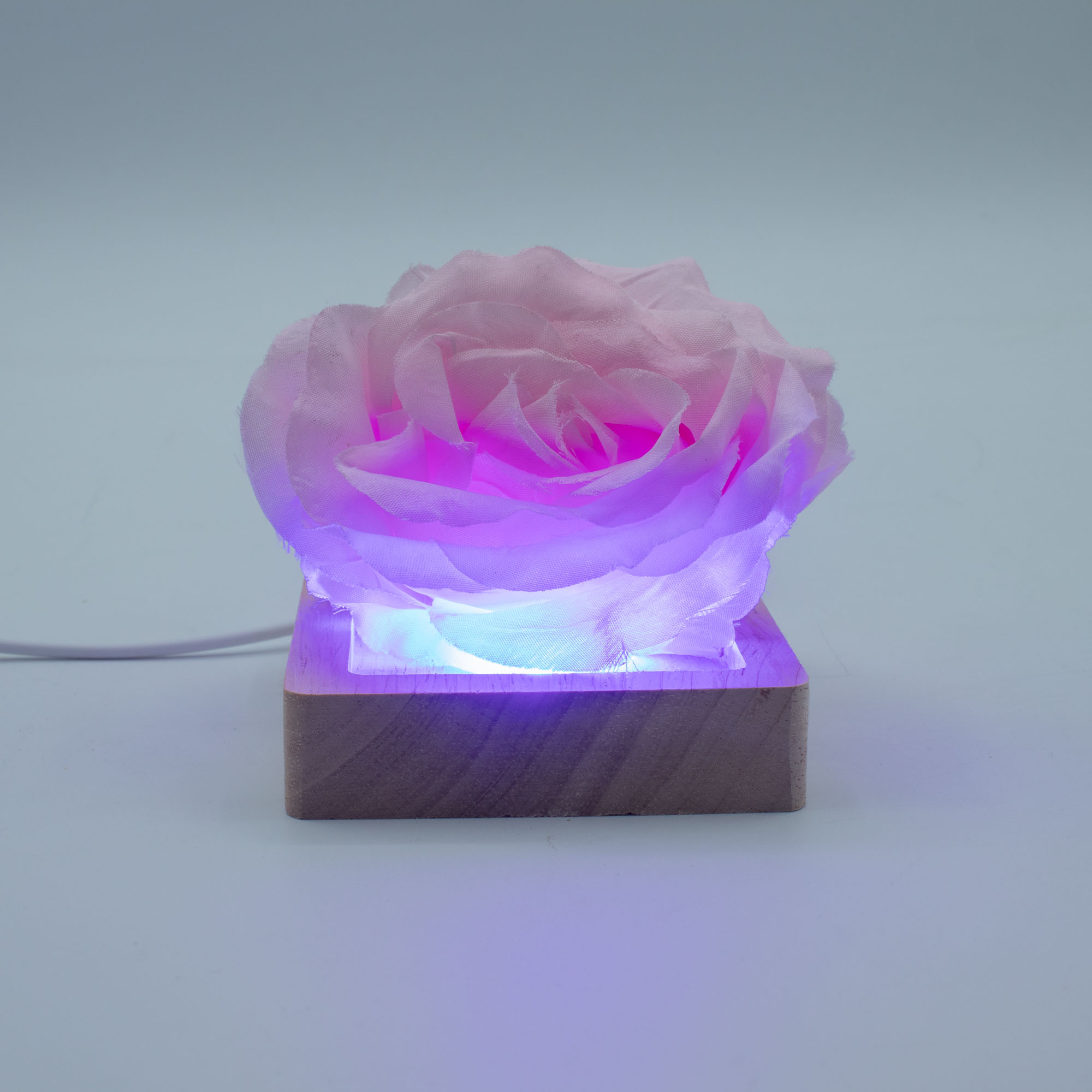 Gemaakt van natuurlijk hout, blijft de basis subtiel, zodat het product erboven het middelpunt blijft terwijl de tinten zachtjes wisselen. USB-gevoed en uitgerust met een praktische inline aan/uit-schakelaar, is de stand eenvoudig te gebruiken op balies, schappen, etalages en tentoonstellingsruimtes. Geen batterijen, geen vaste installatie.