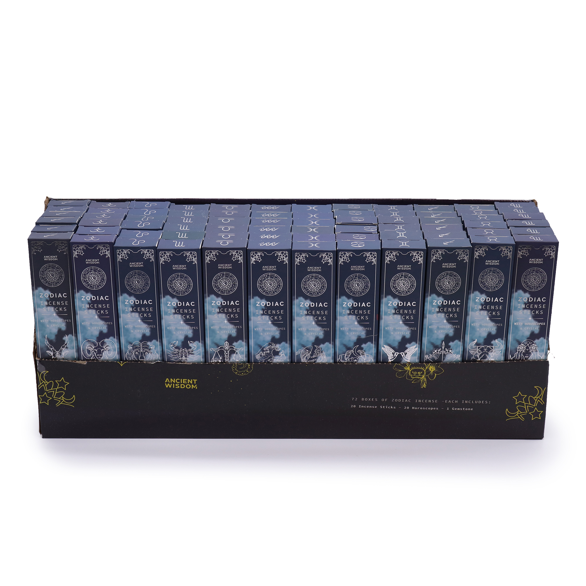 Deze Starter Pack biedt de volledige Zodiac Kristal Geuren Wierook - Startset collectie in één eenvoudige bestelling. Je ontvangt alle 12 zodiac-ontwerpen, met 6 stuks per sterrenbeeld, plus een displaydoos die de hele collectie kan bevatten.